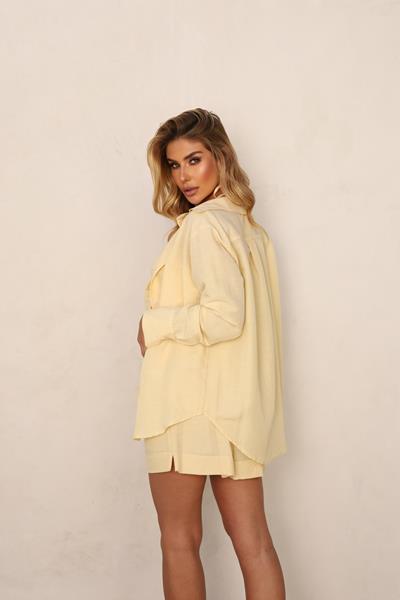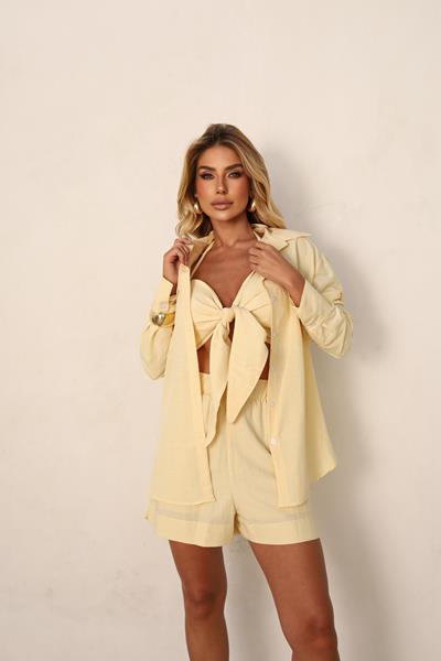 Trijunto em tecido crepe flamê une top laço, short e camisa para composições cheias de estilo, seja usado junto ou separado.